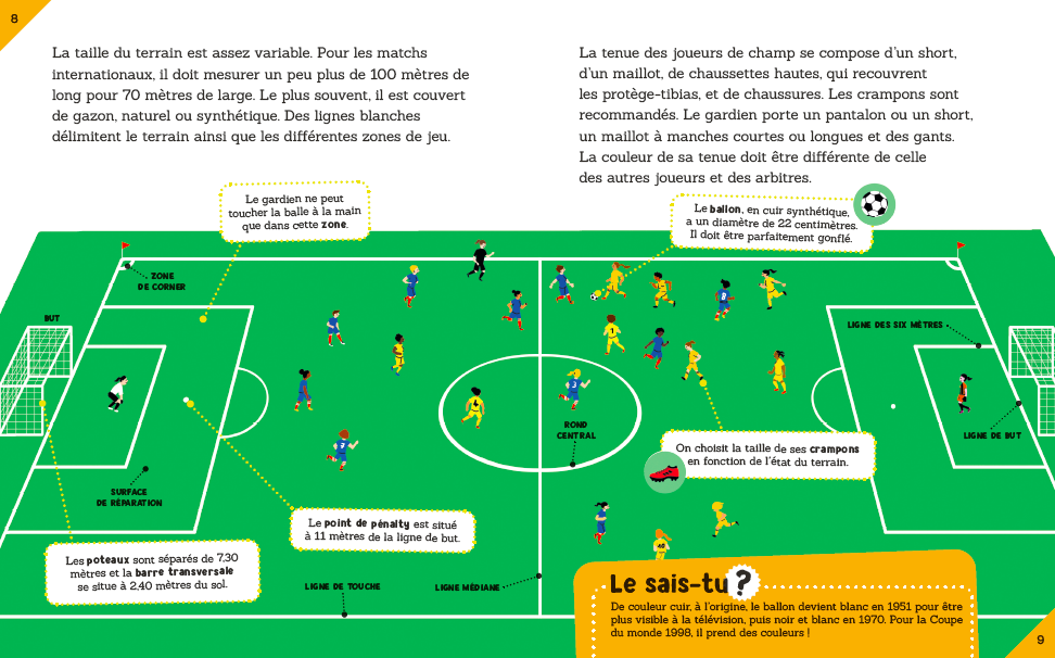 les différents postes, les plus beaux gestes techniques, mais aussi l’entraînement dans une école de foot, les grandes compétitions, les équipes les plus titrées et les meilleurs joueurs de l’histoire.