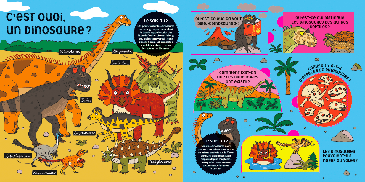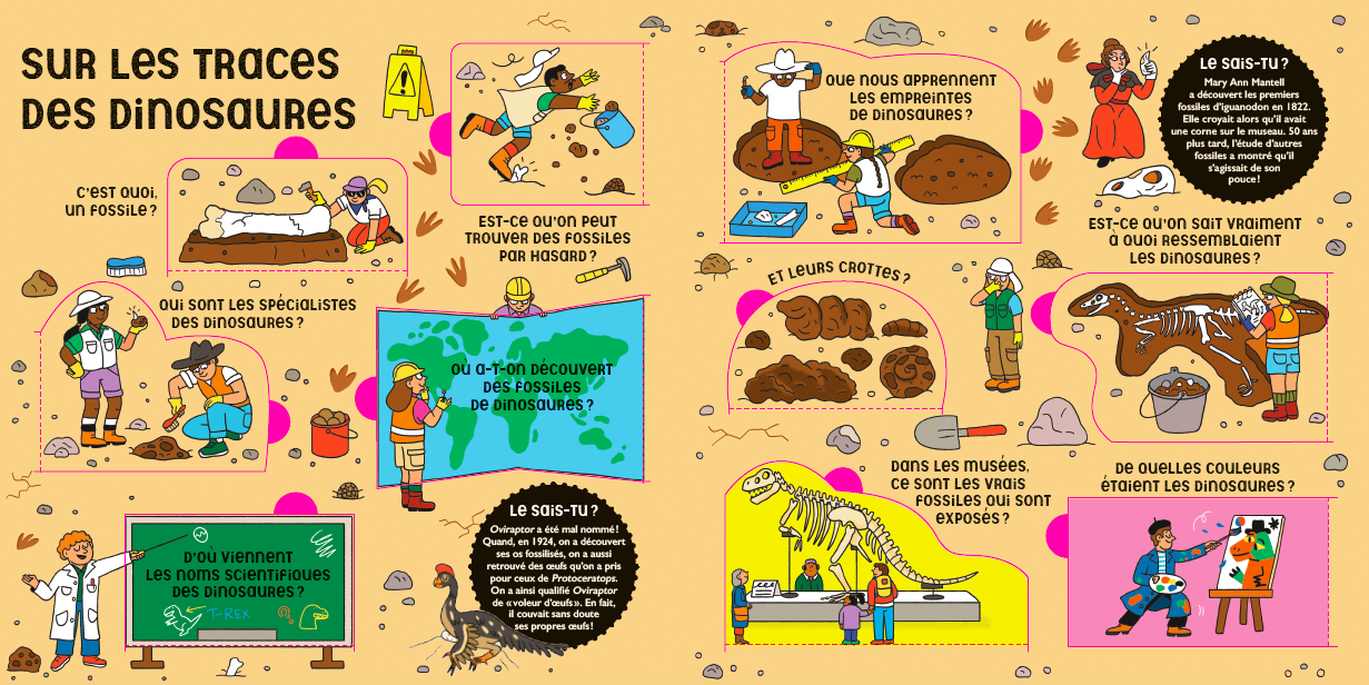 Thématiques abordées : C’est quoi, un dinosaure ? – Sur les traces des dinosaures – Le monde des dinosaures – Les herbivores et les carnivores – Tous différents ! – La disparition des dinosaures.