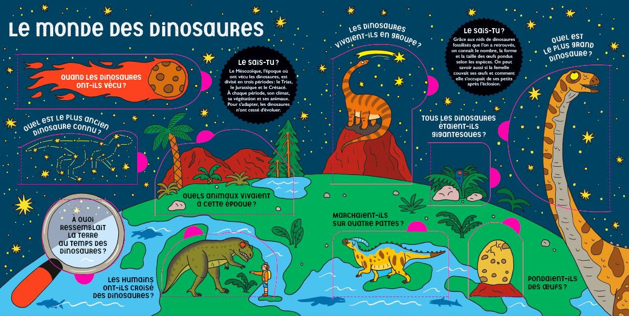 avec plus de 50 flaps à soulever, le petit lecteur va découvrir des réponses à toutes ses questions sur les dinosaures.